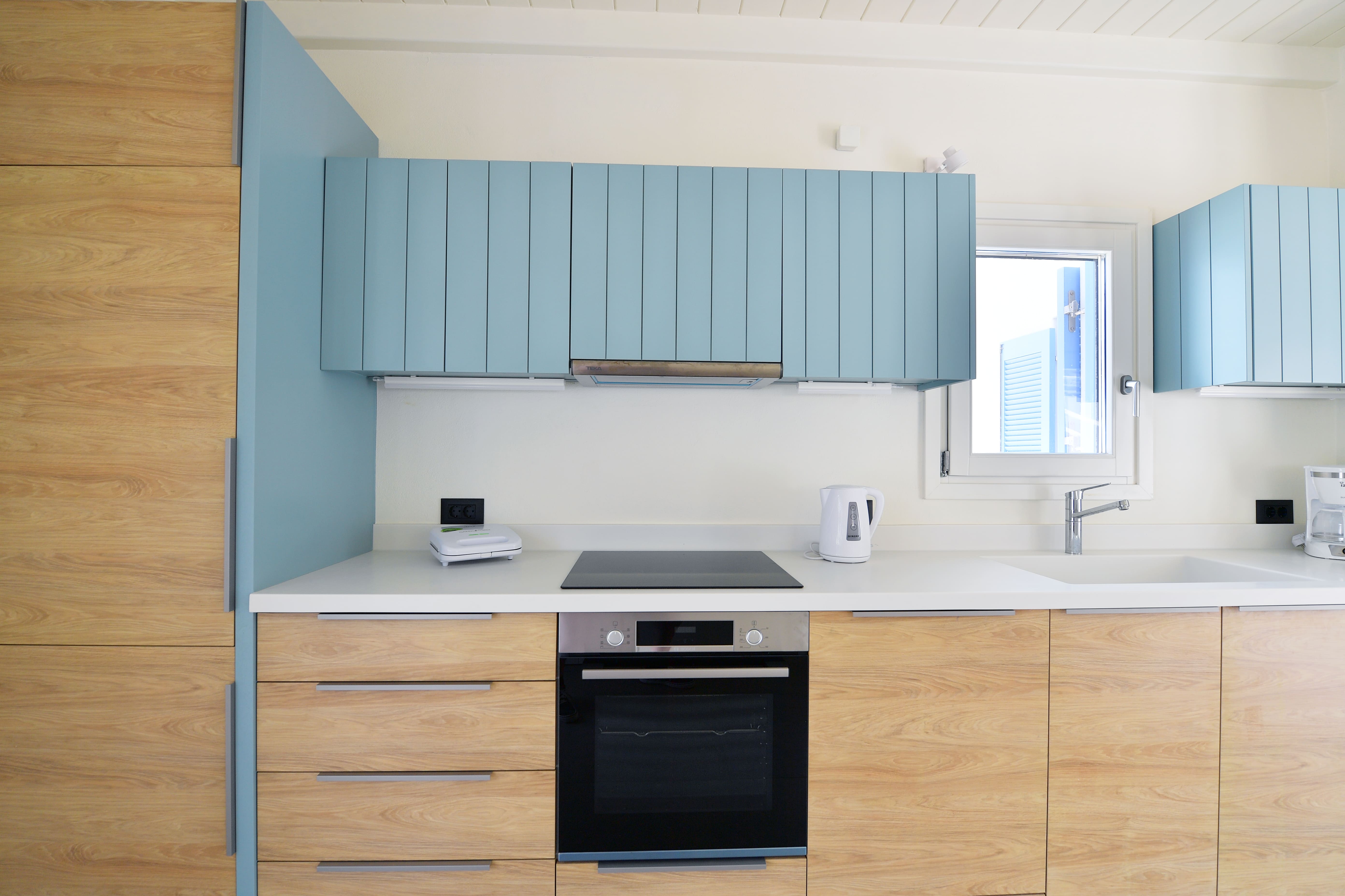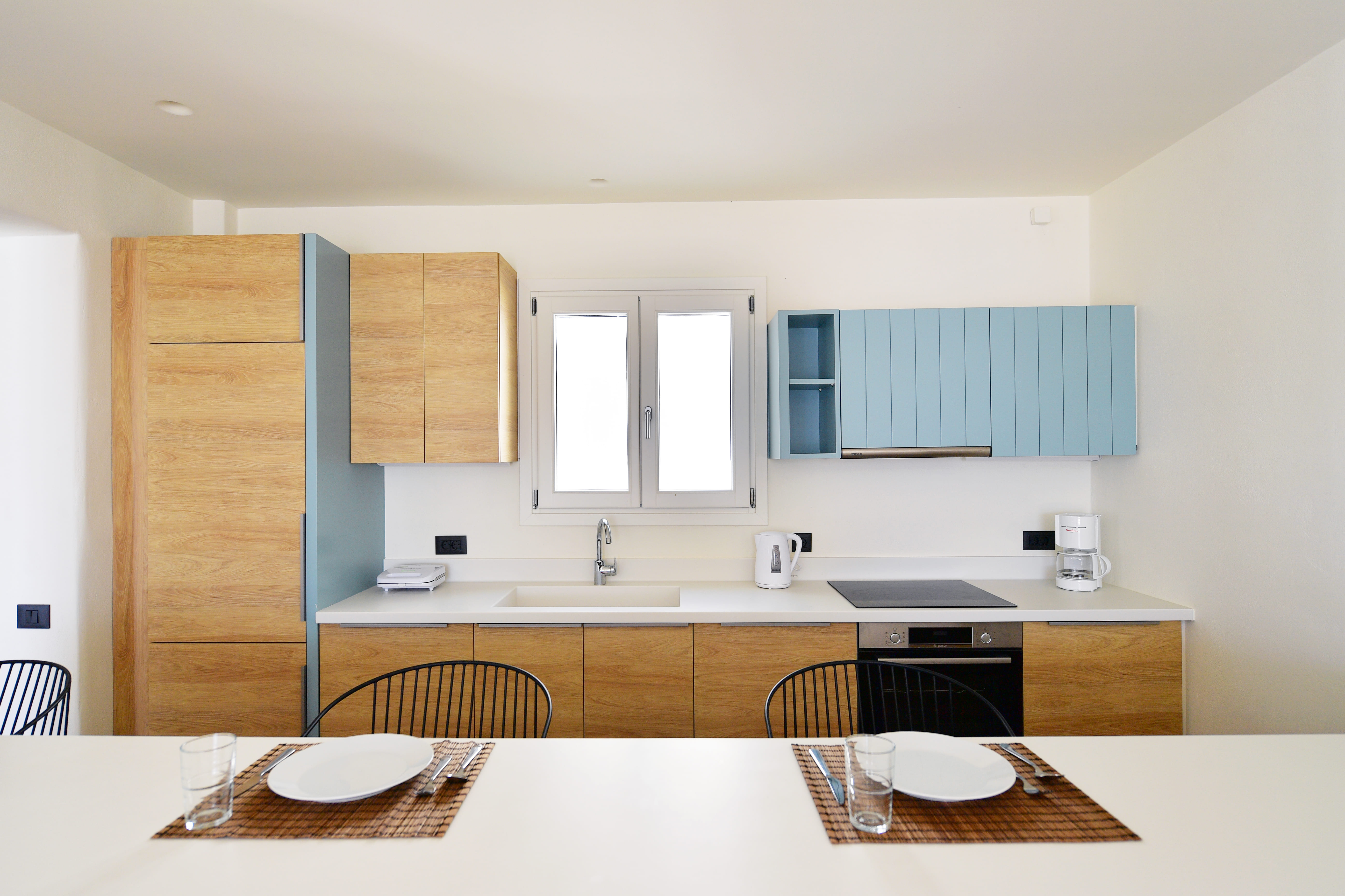 The kitchen features modern appliances, including an oven, coffee maker, dishwasher, stovetop, cookware, dishes, and cutlery. It provides the perfect setting to cook together with friends or family, whether preparing a casual breakfast, a traditional Naxian lunch, or a cozy homemade dinner. Imagine gathering around the table, sharing laughter and stories while creating delicious meals, then enjoying them on the terrace with views of the sparkling pool and the Aegean Sea. This kitchen isn’t just functional—it’s a space for memorable moments and shared culinary experiences.